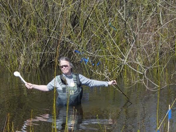 It has always been magical for me to see our volunteers “suit up” in the corporate parking lots next door, donning chest waders and heading off into the woods with paddles under one arm and large bamboo poles in the other.