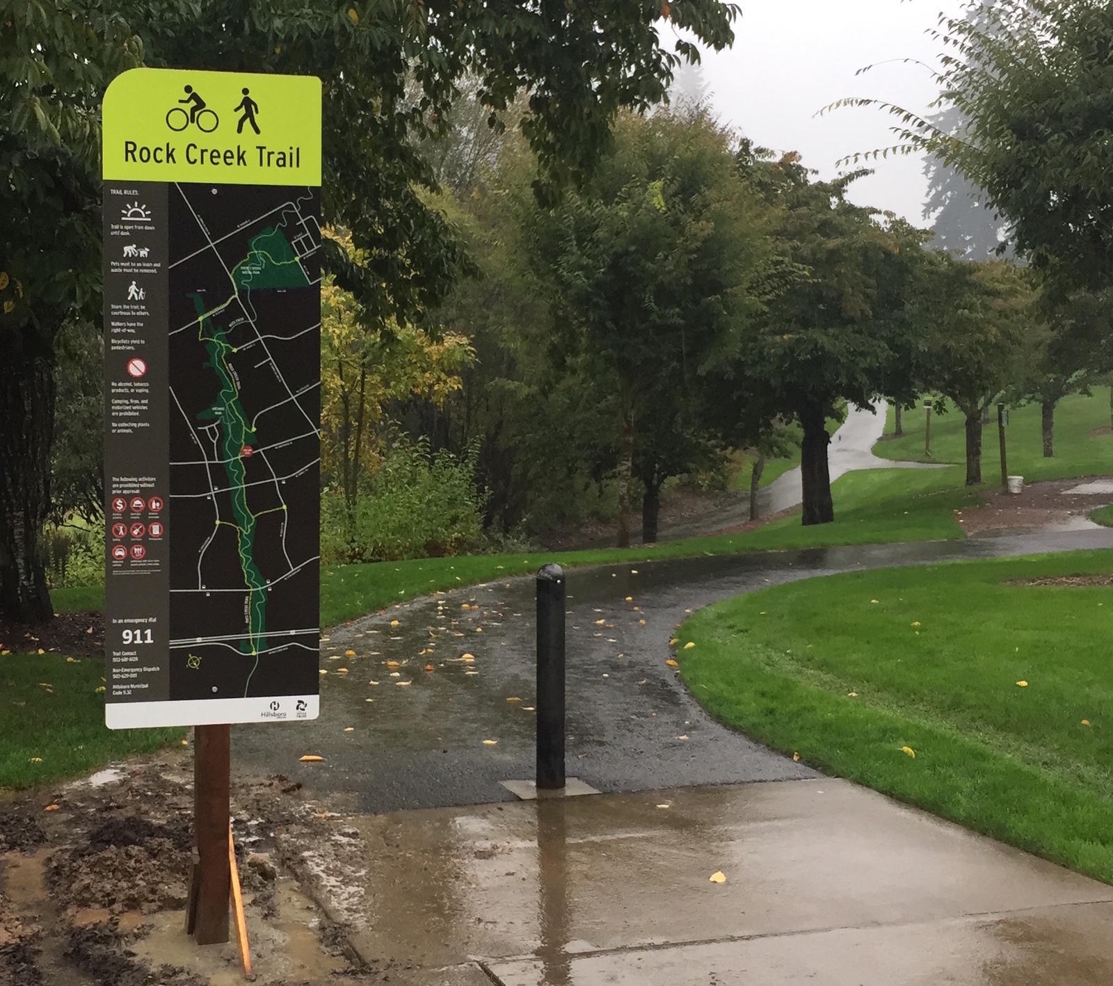 With the new guidelines in hand, the race was on to put signs on as many of the region’s trails as we could. As is so often the case with regional trails, Tualatin Hills Park & Recreation District was first out of the gate and off to an early lead. THPRD wasted no time installing new Intertwine signs on its three biggest regional trails – the Westside, Rock Creek and Fanno Creek trails.